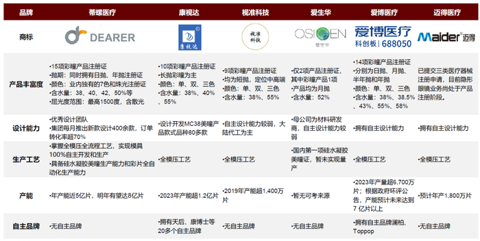 ► 丰富的核心资质为下游客户提供多样化的选择,满足品牌端生产需求。根据NMPA数据,截至2023年12月,爱博医疗旗下的天眼及优你康已取得14项彩瞳产品注册证,蒂螺医疗已取得15项注册证。取得丰富的医疗器械产品注册证能够帮助企业更好地满足品牌端的生产需求。