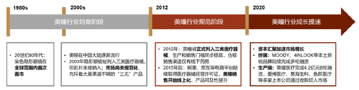 国内美瞳市场逐渐规范化,资本汇聚促进行业增长提速。2012年起国家大力整顿美瞳行业,美瞳正式被列入三类医疗器械严格审批监管;2015年后美瞳品牌开始入驻主流电商平台。2020年多个本土美瞳品牌和生产厂商获得大额融资,行业发展进一步提速。