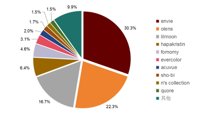 相比于隐形眼镜行业,全球美瞳行业集中度相对较低。根据前瞻产业研究院的数据,2020年全球美瞳行业市占率前三的品牌分别为envie、olens和lilmoon,占比30.3%、22.3%和16.7%。相比于隐形眼镜行业,美瞳行业集中度较低。