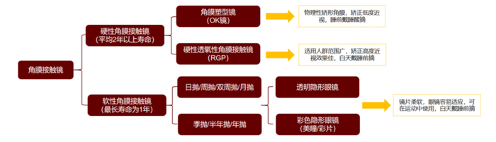 隐形眼镜按材质划分为硬性和软性,软性隐形眼镜分为透明片和美瞳两类。隐形眼镜又称角膜接触镜,通过直接贴附在角膜的泪液层上,与人眼生理相容,达到视力矫正目的。根据材质的软硬程度可以划分为软性和硬性角膜接触镜,前者根据镜片是否着色又可分为透明和彩色隐形眼镜,彩色隐形眼镜即“美瞳”。