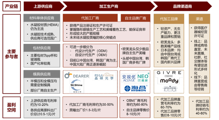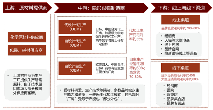 隐形眼镜产业链:下游终端较分散,中游竞争格局稳定、利润空间可观,代工模式为主流。