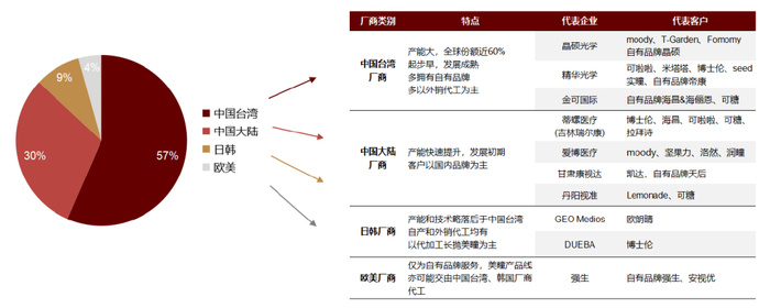 国内美瞳产业目前呈现多元化竞争格局,中国台湾厂商占据主导地位,大陆企业正在迅速崛起。中国台湾企业已在国内乃至全球市场占据可观份额;日韩厂商也承接部分代工业务;欧美头部厂商以自产普通隐形眼镜产品为主,仅强生等少数厂商自主生产美瞳,其余大多代工。大陆厂商逐步崛起,正处于快速成长期。
