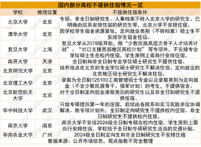 纵观内地高校,有如北京大学发布公告表示,专业学位研究生(专硕)、非全日制研究生、人事档案不转入北京大学的研究生、已明确由院系安排住宿的研究生等不安排住宿;复旦大学从2019级开始除“少数民族高层次骨干人才培养计划”等专项外,不安排专业学位硕士生在校内住宿,学生原则上需自行安排住宿;清华大学同样发布公告表示因学校学生宿舍资源紧张,定向就业类别(不转档案)硕士生不安排学生宿舍住宿。