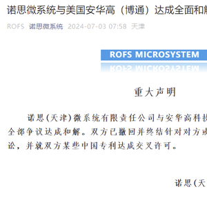 7月3日早晨,诺思(天津)微系统有限责任公司(以下简称“天津诺思”)与安华高科技股份有限公司(多年前已与博通合并)已就双方全部争议达成和解。双方已撤回并终结针对对方或其关联公司及客户的诉讼,并就双方某些中国专利达成交叉许可。至此,双方之间持续了9年之久的恩怨至此画上了一个句号。