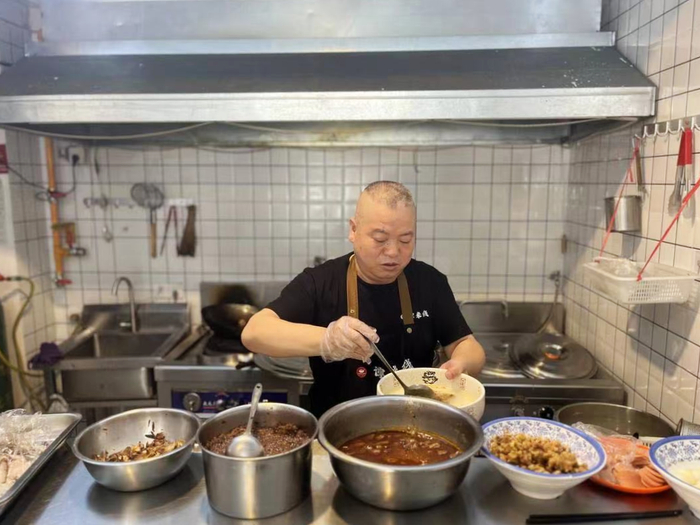 店主谭厚成,1990年从云南某部队退役后,便来到温江生活工作。三十多年来,云南米线的滋味让他念念不忘。今年4月初,他与两名战友商议,合伙开起了这家米线店。米线店在成都市第五人民医院附近,食客有不少是到医院就诊的患者或患者家属。谭厚成发现,有些顾客为了省钱,常常点最便宜的餐食,生病本来就需要补充营养,这让作为店主的他时常感到无奈,于是他萌生了一个念头: