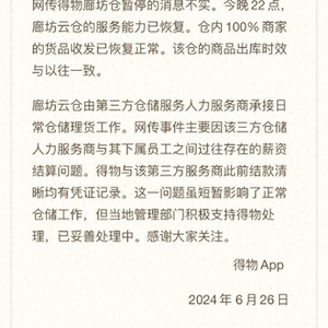 据媒体报道及得物回应,此次廊坊仓事件系得物方与服务商纠纷导致云仓员工被欠薪,从而发生了“停摆风波”。