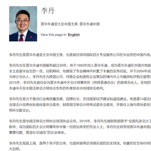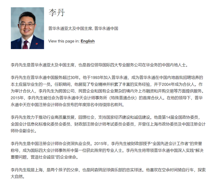据普华永道官网,李丹是普华永道亚太及中国主席,也是首位领导国际四大专业服务公司在华业务的中国内地人士。李丹在普华永道中国服务超过30年。他于1993年加入普华永道,成为普华永道在中国内地首批招聘培养的本土应届毕业生的一员。任职期间,他展现了专业精神并积累了丰富的实务经验,并于2004年成为合伙人。作为审计合伙人,李丹先生为跨国公司、民营企业和国有企业复杂的境内外上市融资和并购交易等方面提供服务。2015年,李丹被任命为普华永道中天会计师事务所(特殊普通合伙)的首席合伙人。在他的领导下,普华永道中天在中国注册会计师协会发布的年度排名中持续排名前列。