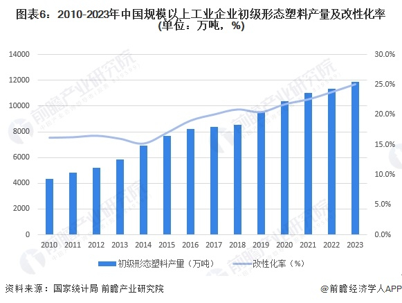 改性化率(改性塑料产量/塑料产量)是用来衡量改性塑料行业在塑料工业中地位的指标。根据国家统计局的统计数据显示,2010-2022年,我国规模以上工业企业初级形态塑料总产量从4361万吨上升至10355万吨,与此同时,我国塑料改性化率也由2010年的16.2%增长到2023年的近25%。