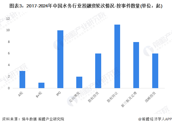 2017年以来,水务行业的投融资轮次集中在股权转让、IPO、新三板及定增轮次,分别发生事件11起、10起、8起。总体来看,水务行业的投融资处于成熟阶段。
