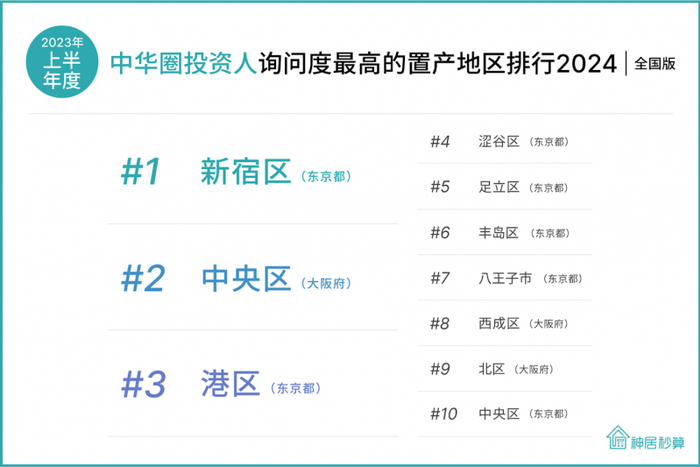 根据咨询数量统计,2023年全年度的咨询度排行,询问度最高的三个地区分别如下,第一名:东京都新宿区、第二名:东京都丰岛区、第三名:大阪府大阪市中央区。