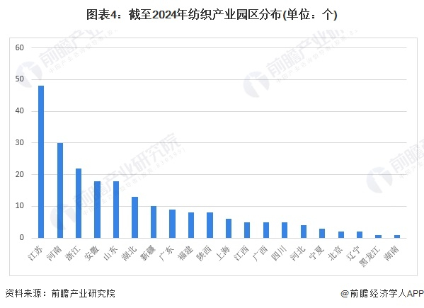 目前纺织行业相关产业园区数量比较多,前瞻产业园区数据库显示,截至2024年5月20日我国纺织产业园区共有218个,主要分布于江苏省,纺织产业园区数量高达48个,其次为河南和浙江,两省纺织产业园区数量均在20个以上。