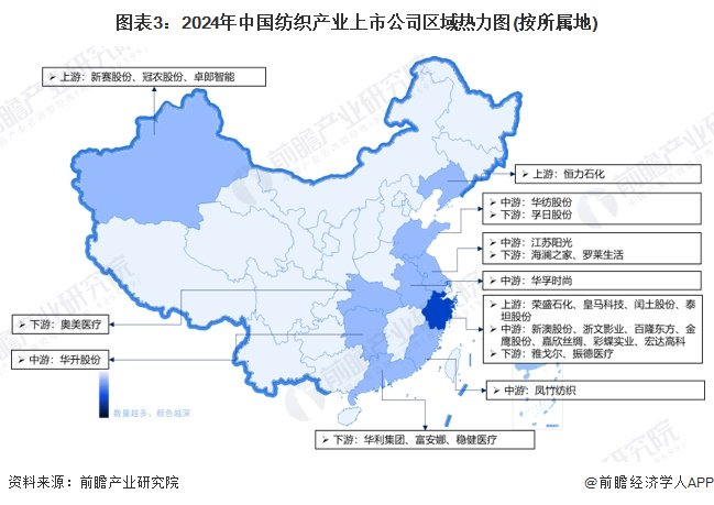 从我国纺织产业链企业区域分布来看,浙江省企业分布最为集中,上中下游均坐落多家代表上市企业,其余地区企业分布较为分散,上市企业数量较少,具体分布如下: