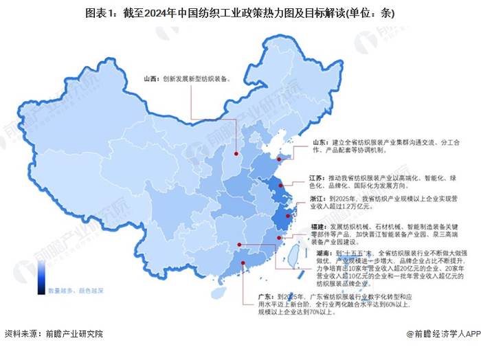 截至2024年5月24,全国各省市公布的纺织政策数量超万条,部分省(市、自治区)把纺织产业作为经济发展的战略支柱产业,其中浙江和江苏政策数量最多,从政策规划目标来看,到2025年,浙江省纺织产业规模以上企业实现营业收入超过1.2万亿元,江苏省以高端化、智能化、绿色化、品牌化、国际化为纺织工业发展方向。