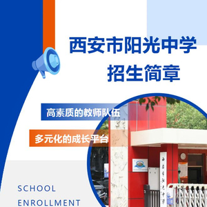 西安市阳光中学(原名西安交大阳光中学)是2022年经西安市教育局批准设立,由雁塔区教育局委托西安交大教育管理集团管理的一所公办完全中学。学校秉承“依法治校、以德立校、特色兴校、质量强校”的办学宗旨,倡导“一切为了学生,让学生在学校快乐学习,健康成长;以生为本,质量立校,个性发展,全面推进素质教育”的办学理念,积极推进教育教学改革,着力打造高素质专业化教师队伍,聚焦学生核心素养发展,培养学生良好的道德品质和终身学习能力,实现了“低进高出、高进优出、优进特出”的培养目标,教育教学质量得到了教育行政部门和家长、社会的充分认可。学校先后荣获“全国教育改革创新先进示范校”“全国素质教育先进单位”“全国青少年校园排球特色学校”“全国青少校园足球特色学校”“陕西省艺术教育示范学校”“西安市德育工作先进集体”等荣誉。学校与西安市第七十八中学组建了西安市阳光中学“名校+”共同体,携手共建老百姓家门口的好学校,合力助推区域教育优质均衡发展。