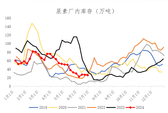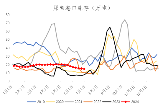 截至6月28日,尿素企业总库存量25.56万吨,同比增加偏低7.03万吨。上半年从4月份开始,工业需求强劲,尿素企业库存持续下滑,与去年同期相比,厂内库存偏低,对尿素价格具有较好的支撑作用,这也是今年二季度现货价格与去年走势背离的原因。