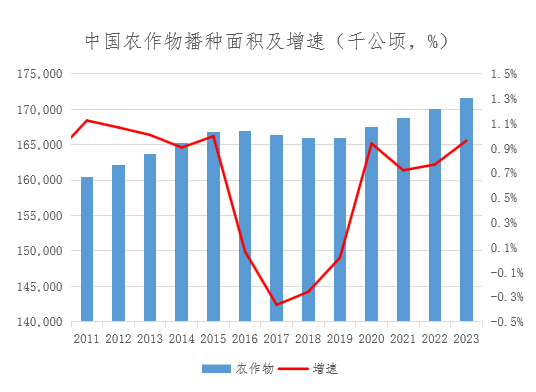 从政策文件来看,粮食稳产仍是首要任务,2023年我国粮食总产量达13908.2亿斤,比上年增加177.6亿斤,增长1.3%,连续9年稳定在1.3万亿斤以上。从政策表述看,“稳定播种面积、着力提升单产”,虽然种植面积继续扩张有限,但从提高单产的角度而言,化肥依然发挥重要的积极作用,预计将维持刚性增长的情况。