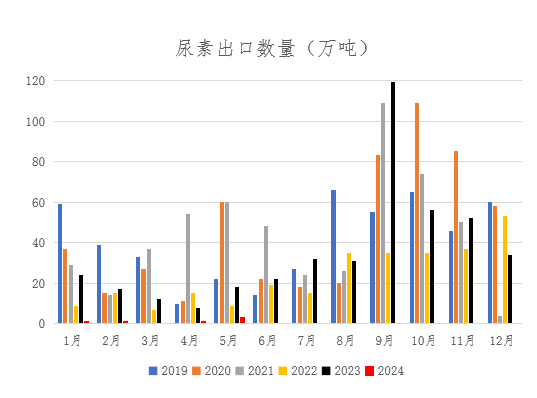 2024年1-5月份我国尿素出口量月6.5万吨,同比去年下降73万吨,同比下降92%以上。