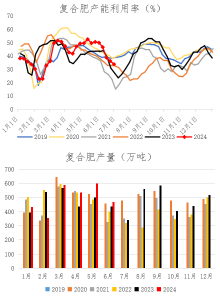 截止到6月28日,复合肥开工率33.77%,上半年平均开工率44.41%,同比偏高0.34个百分点。1-6月份复合肥产量2976万吨,同比回升3.61%。