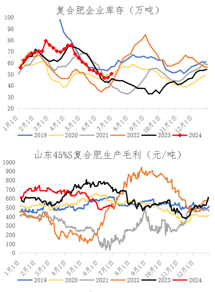 从产能投放角度看,下半年预计有395万吨的投产计划,目前复合肥厂内库存中等,库存压力不大,利润状况亦较好,但是下半年主要是8-9月份的高磷复合肥,对于氮元素的需求环比上半年3-5月份高氮复合肥的生产会出现下滑。