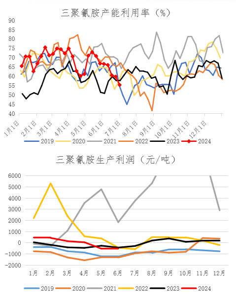 往年走势上看,三季度是相对淡季阶段,四季度产量会继续回升,总体下半年产量环比回升与否主要受生产利润和出口需求影响,亏损状态下,检修力度会加大。上半年国内需求疲弱,三聚氰胺生产利润持续下滑,6月份山东生产利润约-490元/吨,目前三聚氰胺市场供需存在矛盾,预计后续价格偏弱运行为主,下半年产量或难超上半年。但从产能投放角度看,下半年预计投放44万吨,往后两三年仍处于产能扩张周期,有超200万吨的投产计划。(数据来源:Mysteel、冠通研究)