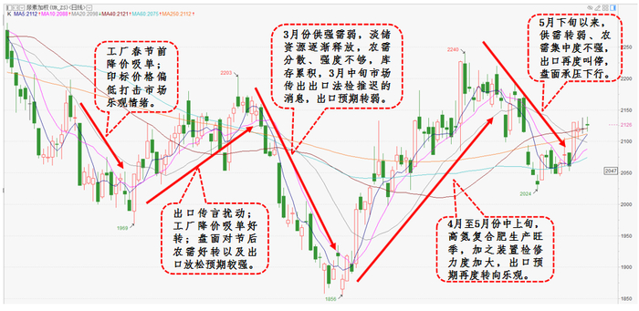 1月尿素期货在元旦假期后出现“开门红”,随后因印标价格偏低打击市场乐观情绪,盘面出现下挫。2月份尽管现货市场因春节假期的原因表现较为平淡,但是期货盘面上市场更多交易节后农需修复以及出口放松的强预期的逻辑。3月份来到节后需求验证阶段,尿素供需宽松背景下,法检政策未有放松、出口需求转弱,盘面承压大幅下,跌破震荡区间下沿。4月1日,尿素下探去年10月低位附近后获得支撑,走出了一波反弹;盘面上交替交易出口预期和基本面情况,4月12日出口政策放松奠定市场乐观基调,加之高氮复合肥生产支撑尿素需求,盘面价格持续走高。5月上中旬,高氮复合肥生产仍处旺季、日产边际回落,尿素延续震荡反弹的态势;5月下旬以来复合肥生产转弱、农需跟进一般,出口再度叫停,加之商品市场整体走弱,尿素亦承压回调。(数据来源:博易大师、冠通研究)