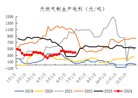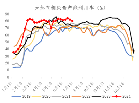 截至6月28日,晋城无洗小块价格1250元/吨,1-6月份基本维持在1050-1300的区间内运行,均价1134元/吨,同比去年下滑31.4%;秦皇岛港口山西产的Q5500动力煤平仓价848元/吨,1-6月份维持在800-950的区间内运行,均价875元/吨,同比去年下滑14.7%。展望下半年,我们认为煤炭供应边际上仍有增量、进口煤供应预计依旧充足;需求端主要关注天气对电厂日耗的影响,此外国务院5月29日印发的《2024-2025年节能降碳行动方案》中明确提出了“重点削减非电力用煤”,非电用煤需求亦需注意,总体上预计,下半年煤炭保持相对宽松的供需状态,对于尿素来说成本压力不大,预计不会对尿素的生产产生明显影响。(数据来源:Wind、冠通研究)