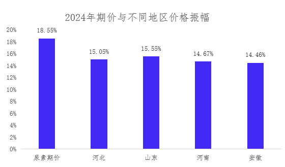 期现货价格走势基本上一致,价格相关性较高。尿素期货市场的波动幅度明显大于其他地区,期货市场虽然持续贴水运行,但基本可以覆盖现价的波动幅度。