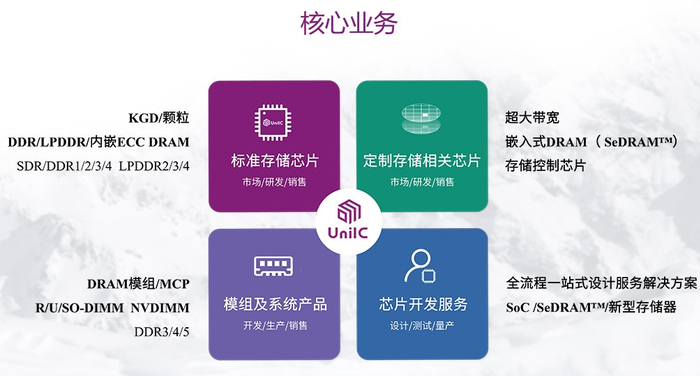 紫光国芯是以DRAM(动态随机存取存储器)存储技术为核心的产品和服务提供商,核心业务包括标准存储芯片,模组和系统产品,嵌入式DRAM和存储控制芯片,以及专用集成电路设计开发服务,产品包括DRAM KGD、DRAM颗粒、DRAM模组、系统产品和设计服务。