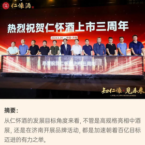 2024年,是仁怀酒品牌上市的三周年,三年时间中,仁怀酒实现了品牌价值超100亿的成绩,并在市场方面先后在北京、上海、天津、广东、浙江、河南、江苏、山东、湖南、湖北、江西、内蒙古等20多个省市、自治区建立不同形式的销售渠道,合作经销商300多家,在京东、天猫、抖音等线上销售系统建成了全覆盖式线上销售网络。