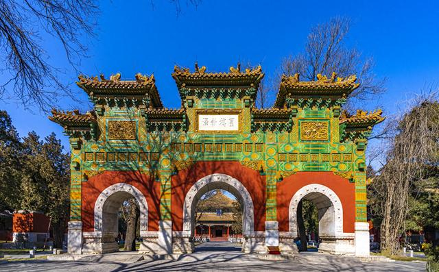 北京国子监是元、明、清三朝的国家最高学府及教育行政管理机构,坐北朝南,按“左庙右学”之制,东邻孔庙。其内由三进院落组成,占地2万多平方米,主要建筑自南而北依次为集贤门、太学门、琉璃牌坊、辟雍、彝伦堂和敬一亭。国子监的中心建筑辟雍为皇帝讲学所设立,殿前琉璃牌坊上横额题字是乾隆御笔,南面书“圜桥教泽”,北面书“学海节观”。国子监在最繁荣的时期人才济济,容纳了汉族、蒙古族、满族、回族的学生,还接待来自高丽、暹罗等国的留学生。(1962年7月7日《北京日报》2版,《古代最高学府——国子监》)