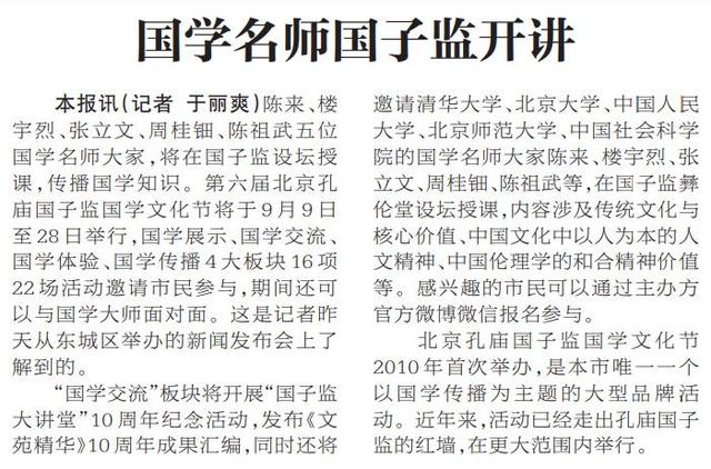 到2017年时,“北京孔庙国子监国学文化节”声名远播,已成为古都文化与国学文化融合的标杆。陈来、楼宇烈、张立文、周桂钿、陈祖武等国学名师大家,先后受邀在国子监彝伦堂设坛授课,传播国学知识。国学展示、国学交流、国学体验、国学传播4大板块16项22场活动全方位满足了广大市民的需求。(2017年8月31日《北京日报》5版,《国学名师国子监开讲》)