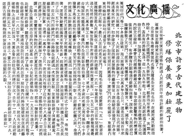 新中国成立前,北京垃圾成山、污水满街。天安门两侧就有两座大垃圾山,而国子监街比任何一条小胡同都脏乱。新中国成立后,北京市人民政府启动对有历史价值建筑物的保护工程,每年按照建筑物的历史价值和损坏情况,有步骤有计划地进行修缮和保养。天安门、故宫、城楼箭楼、天坛斋宫、孔庙、国子监等20多处古建筑在4年内陆续得到修整,施工面积逾15万平方米,是北京城百年来未有的施工规模。(1954年2月27日《北京日报》3版,《北京市许多古代建筑物修缮保养后更加壮丽了》)
