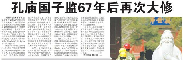 2005年4月,国家级重点文物保护单位北京孔庙和国子监启动新中国成立以来最大规模的文物建筑修缮工程,不但要消除古建筑的各种安全隐患,还计划拆除孔庙和国子监之间人为的分割,使之合成一处文物景观。(2005年4月8日《北京日报》5版,《孔庙国子监67年后再次大修》)