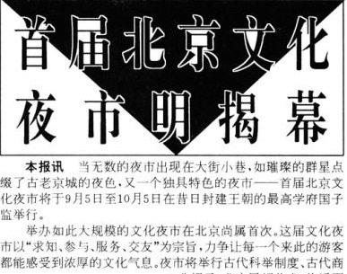 在国家经济快速发展的大形势下,上世纪90年代的城市夜市经济日渐红火,看起来八竿子打不着的国子监也搭上了这趟快车。1992年初秋,北京首届文化夜市在国子监内举行,为期一个月,规模空前。秋天恰逢北京旅游旺季,国子监为中外游客打造了一场国学文化盛宴,一举推出古代科举制度、古代商业幌子、北京民间艺术、绝活百种、柳州奇石、书法篆刻、清代十三经碑林、古代服饰、旧京民俗等多个展览,以及仪表、服饰、化妆、戏剧、文化鉴定等系列文化讲座。最引人注目的是,清朝皇帝亲临讲学的场所——国子监辟雍首次对外开放,吸引了大批市民和游客前往感受何为“天子之学为辟雍”。(1992年9月4日《北京日报》5版,《首届北京文化夜市明揭幕》)