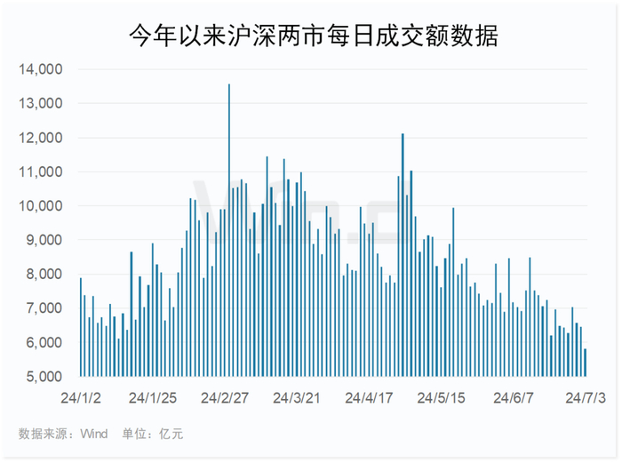 7月3日,A股市场震荡调整,三大指数均小幅下跌,两市成交额为5803亿元,较上个交易日缩量644亿元,成交额不足6000亿元,创下近10个月以来新低。截至目前,两市成交额数据已连续13个交易日不足8000亿元。