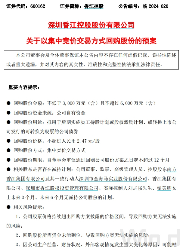 香江控股于7月2日晚间公告称,拟3000万元至6000万元回购公司股份,本次回购股份拟用于后期实施员工持股计划或股权激励计划、或转换上市公司发行的可转换为股票的公司债券。截至目前,公司股价为1.41元/股。