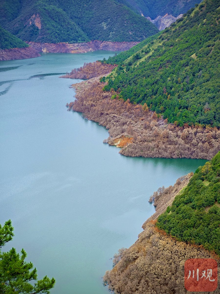 每到夏季,通常从上午10时起,雅江县天龙湖景区就会缓缓掀开面纱。随着浓雾消散,青山之间,蜿蜒游走的湖水清澈凝碧。被高水位淹没的树木,在低水位期显露出来,树木泛黄的躯干恰似海滩的黄沙,在碧水与青山之间形成天然的分界线。