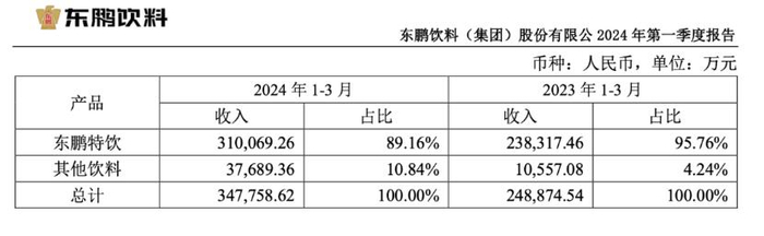 根据东鹏饮料一季度财务报告显示,其中,今年一季度其“大单品”东鹏特饮“斩获”收入310069.26万元,占比高达89.16%;而“其他饮料”收入仅为37689.36万元,占比仅10.84%。其在财报中补充称,“其中东鹏补水啦及东鹏大咖合计收入占比为6.92%。”