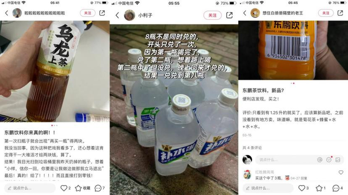 东鹏饮料复刻了过去的打法,“大玩”开盖赠饮的“高中奖率”玩法。包括“乌龙上茶”“补水啦”“菊花茶”等饮品,在社交平台上都被消费者晒出有开盖赠饮的“超高中奖率”。
