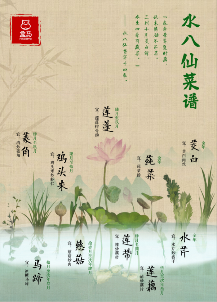 在江南地区,茭白、莲藕、菱角、芡实、莼菜、荸荠、茨菇、水芹等八种水生食物,被称为水八仙。老话说,“春季荸荠夏时藕,秋末慈姑冬芹菜。三到十月茭白鲜,水生四季有蔬菜。”形容的是水八仙贯穿于四季,而近年来,盒马通过候鸟式布局基地、包装服务升级等方式,将这些江南时蔬的尝鲜时间、食用地域无限拓展。