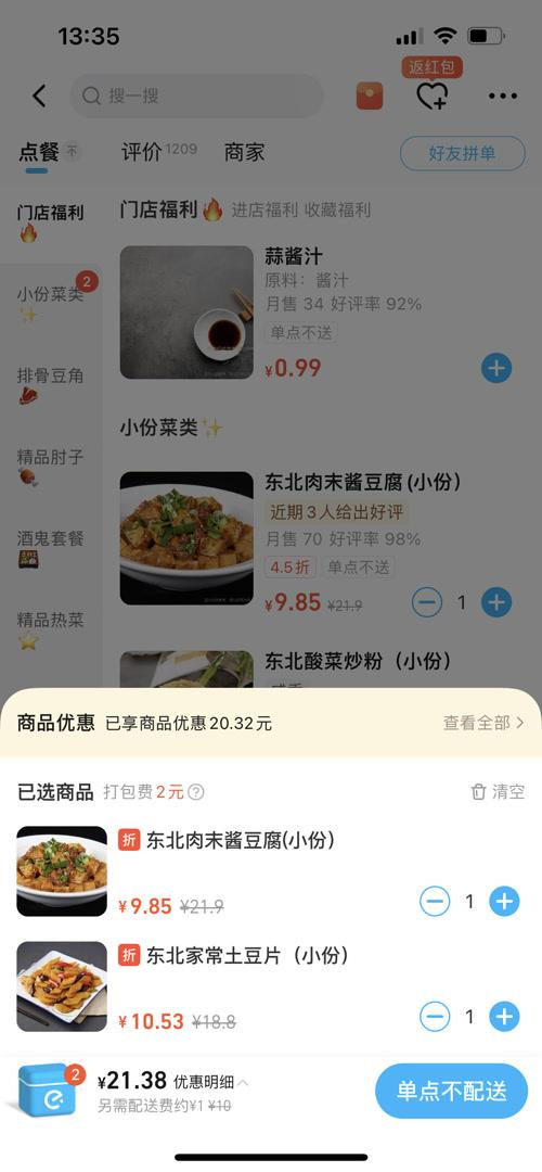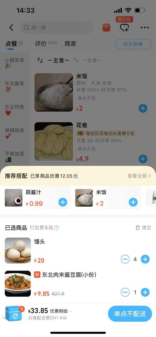 记者将标价9.85元的小份东北肉末酱豆腐和4份馒头加入购物车后,购物车中的应付金额显示为33.85元,凑够了起送价。但谁料,平台的下单页面右下角显示出蓝色提示——“单点不配送”。记者又将馒头更换为标价10.53元的小份东北家常土豆片重新下单,仍然显示“单点不配送”。