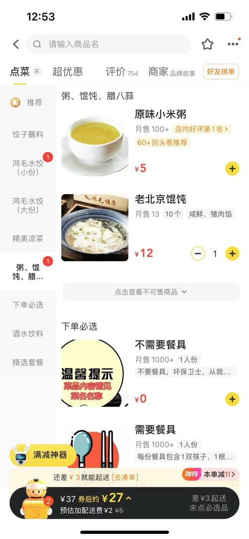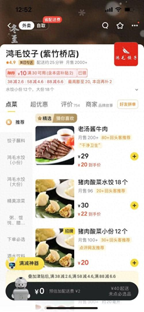 在鸿毛饺子紫竹桥店,记者首先在小份菜专区选择了一份标价22元的猪肉茴香馅小份水饺,小份水饺共有12个。但将菜品加入购物车后,记者很快就遇到了障碍。这家饺子馆设置了“40元起送”的外卖限制。无奈之下,记者又额外将一碗10个的老北京馄饨加入了购物车,但仍差3元才够“起送价”。