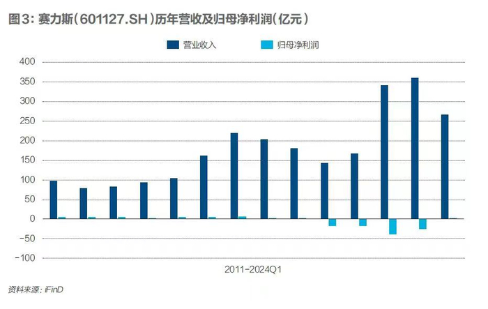 近四年的净利润亏损后,赛力斯在2024年一季度首次迎来盈利,营业收入265.61亿元,同比增长421.76%,归母净利润达2.2亿元,较上年同期增加8.45亿元。