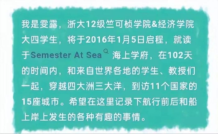 她大学期间就已经穿越四大洲三大洋,与来自世界各地各大名校的学生以及教授共同访问了11个国家的15个城市。