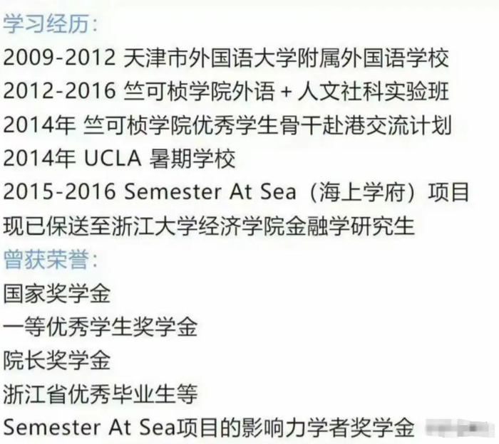 她出生于1994年,本科考入了浙江大学,而后保送至浙江大学经济学院金融学研究生,在学校表现非常突出,多次获国家奖学金,还曾获得浙江省优秀毕业生等荣誉。