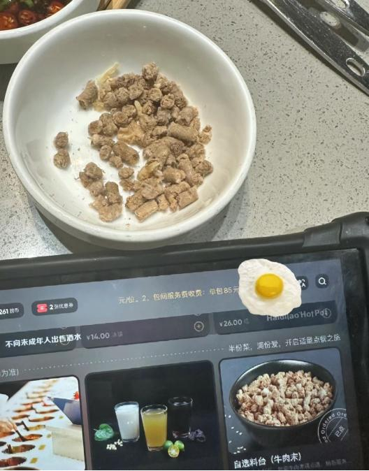 “服务没有(感受到),小零食抠抠搜搜不给,还是我自己要到的,调料台上的牛肉粒没有了,必须请服务员在ipad上下单才给你,汤都喝完了,才把牛肉粒拿上来,一碗就那么几颗,碗底都能看到。”