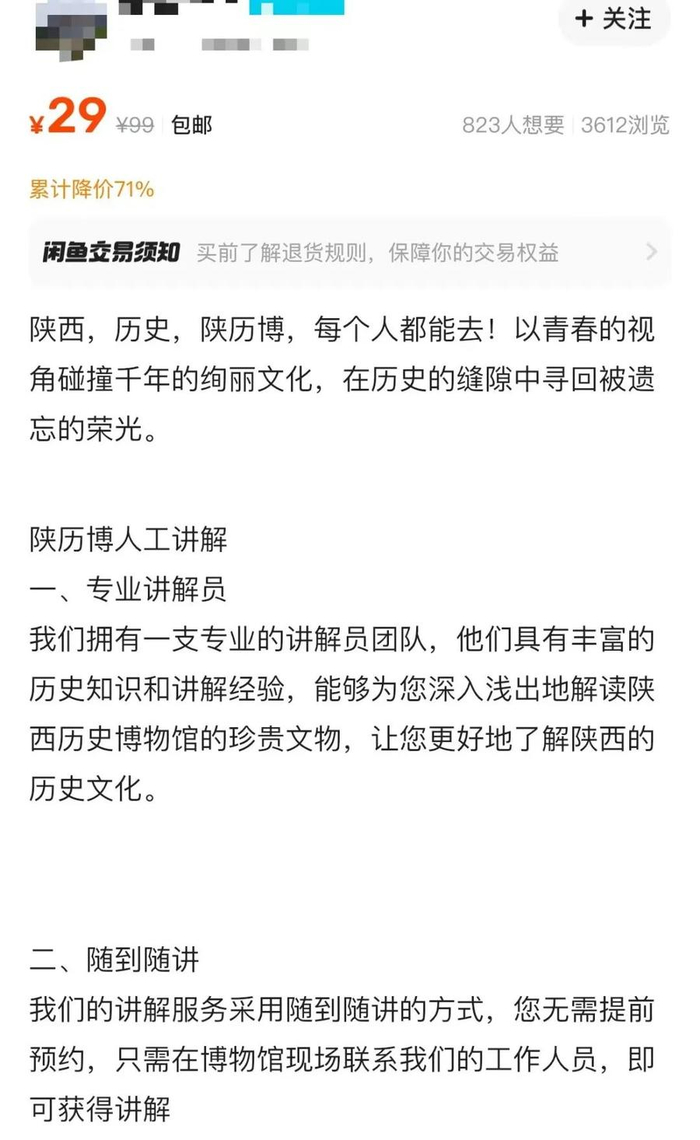 但是,搜索“陕西历史官门票预约”就可以看到,有多家店铺出售“代约服务”,“每个人都能去”“一票通”“随到随讲”这样的关键词很醒目,价格大约从9.9元到480元不等。