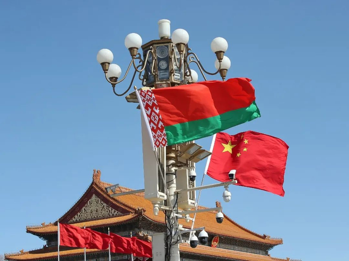 The national flags of China and Belarus at Tiananmen Square welcome Belarusian President Alexander Lukashenko on his state visit to China, Beijing, capital of China, March 1, 2023. /CFP