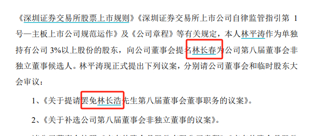 近日,佳隆股份发布公告,75岁的公司董事长林平涛提出了一项罕见的动议——罢免其47岁的儿子林长浩在公司的董事职位,并提名另一个儿子林长春为董事候选人。