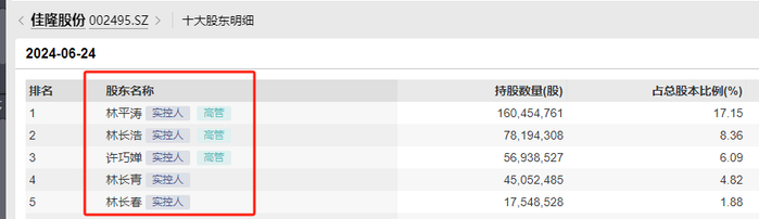 佳隆股份的实控人,一共有五人。他们是一家人,分别是林平涛、许巧婵、林长浩、林长青和林长春。